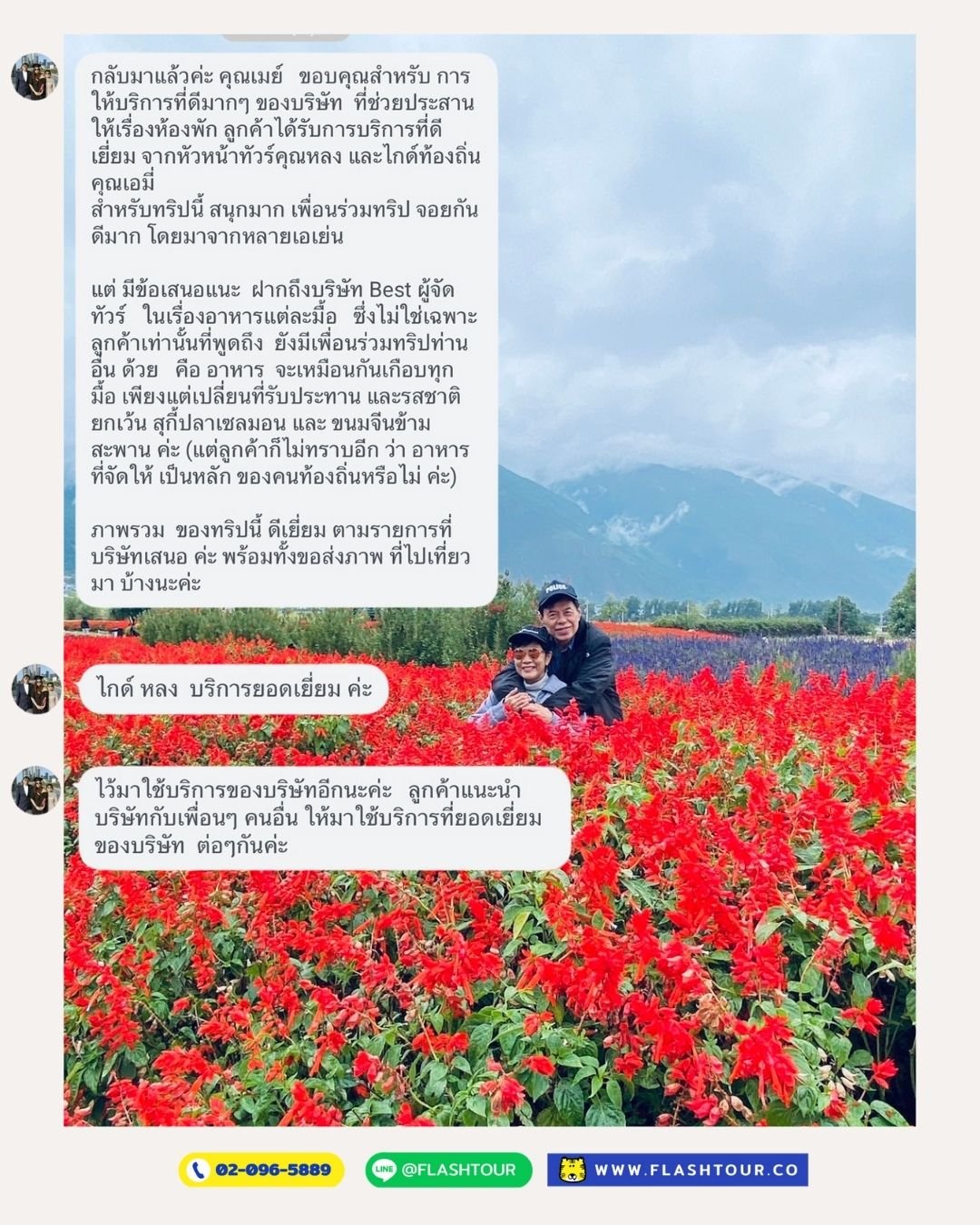 ภาพความประทับใจและคำติชม จากลูกค้าพี่เสือแฟลชทัวร์ FLASHTOUR ขอบพระคุณลูกค้าที่น่ารักทุกท่านและหวังว่าจะได้ดูแลท่านในคราวต่อๆไปนะฮับ!