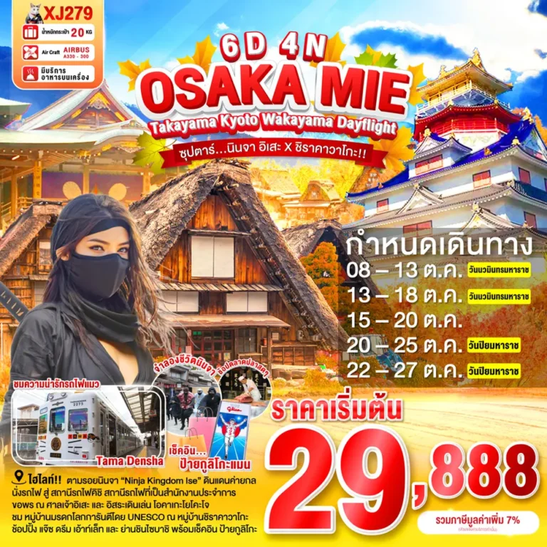 วันที่ 2: มิเอะ - ศาลเจ้าอิเซะจิงงู - ถนนคนเดินโอคาเกะโยโคะโจ - สวนสนุกนินจาคิงดอมอิเสะ - นาโกย่า - มิตซุยเอาท์เล็ตพาร์ค แจ็สท์ดรีมนางาชิมะ